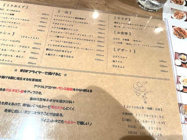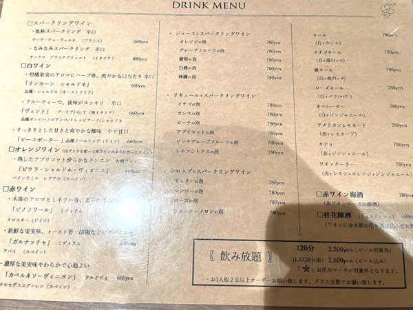 昼からアラカルトのメニューが注文できて、飲み放題も可能です。お店のメニューには、【 飲み放題120分:2,200円(ビール対象外)2,600円(ビール込)】と書かれていますが、ホットペッパークーポンには60分があります。【 飲み放題60分:1,500円(ビール対象外)】 ※いずれも飲み放題は、フード1人2品以上になっています。