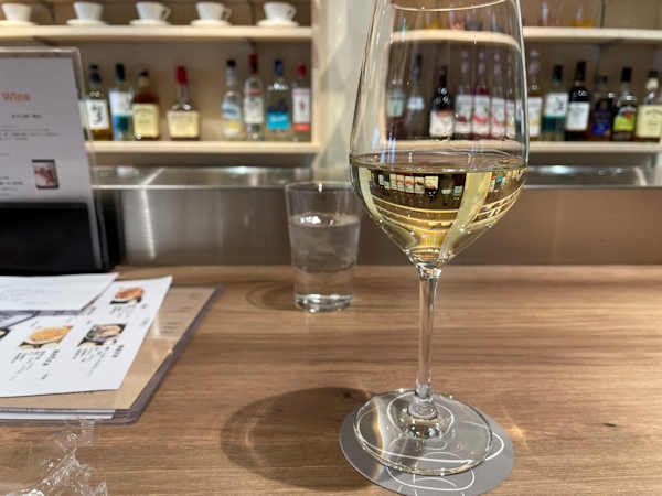 ワインのほかにもドリンクメニュー豊富で、いろいろ楽しめそう。店名にあるように、天ぷらとワインを堪能します。辛口白ワイン リンカーンシャルドネ(660円)を。