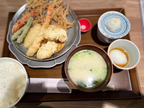 牡蠣天2コ、イカ、レンコン、パプリカ、かぼちゃ、いんげん、エノキと盛り沢山。天ぷらは揚げたてのサクサクで美味、全体的に軽い食感。牡蠣はアツアツで、がっつり食べようとして舌をやけどしそうになりました(苦笑)