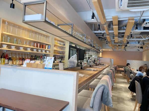 店内も白基調の明るいCaféっぽい。パンケーキやパフェが出てきても、違和感ない空間。カウンター席もあり、1人でも入りやすい。カウンターは2人ずつの腰掛けでセットされています。テーブル席は4人掛け。奥には半個室のテーブル席もあります。