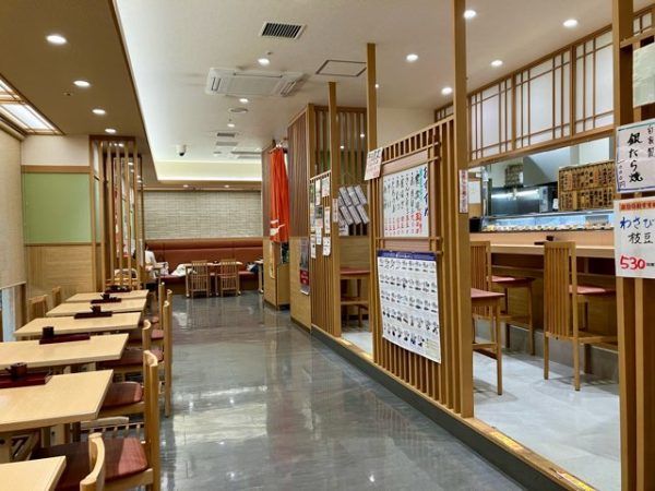 「仙令鮨 セルバテラス店」はセルバテラスの1階にあります。お店は木をふんだんに使った和の風情あふれる素敵な空間です。