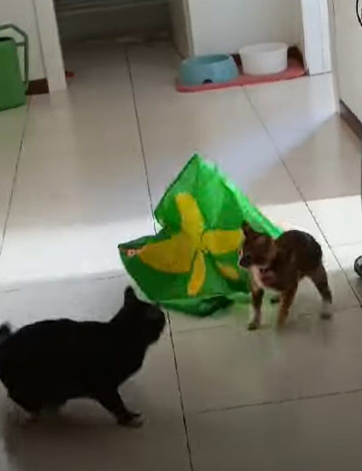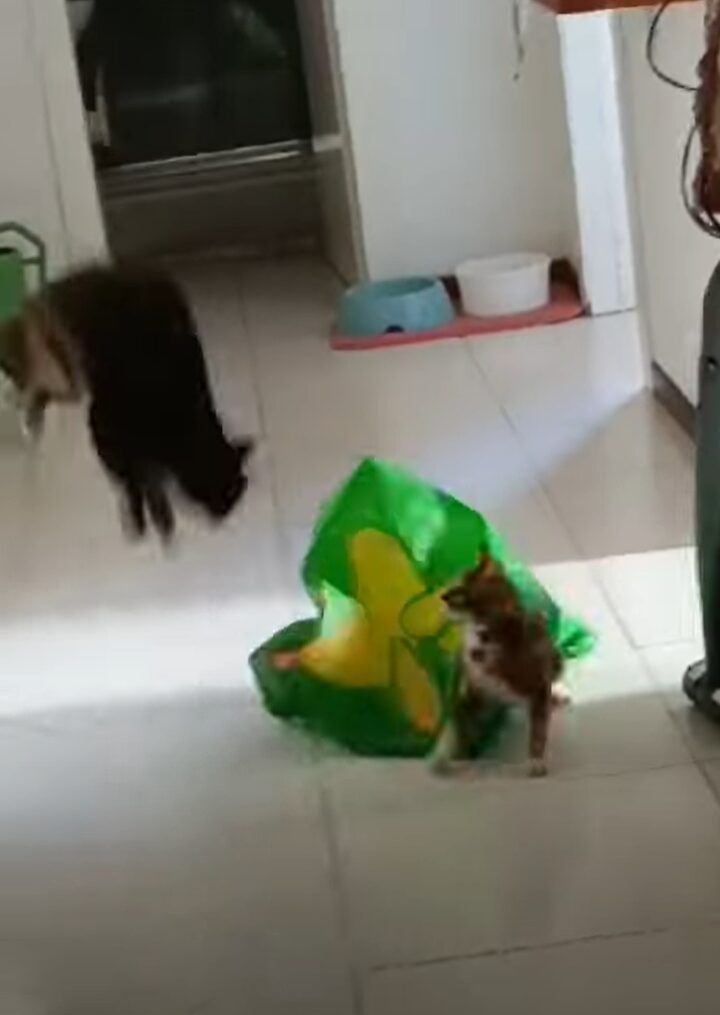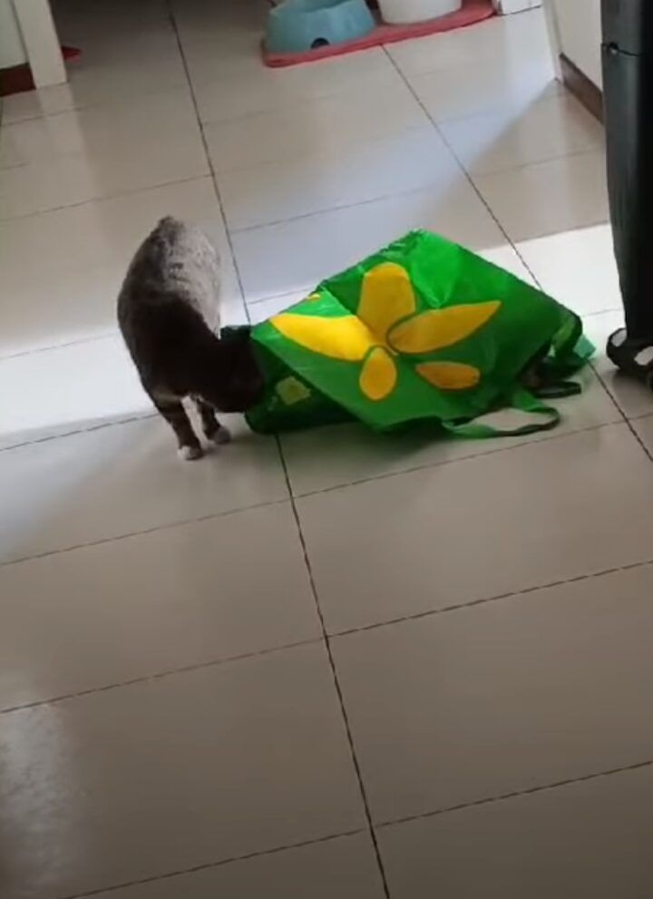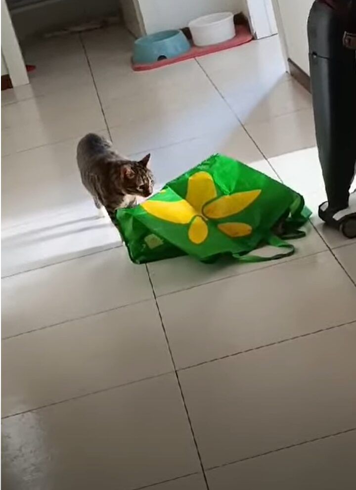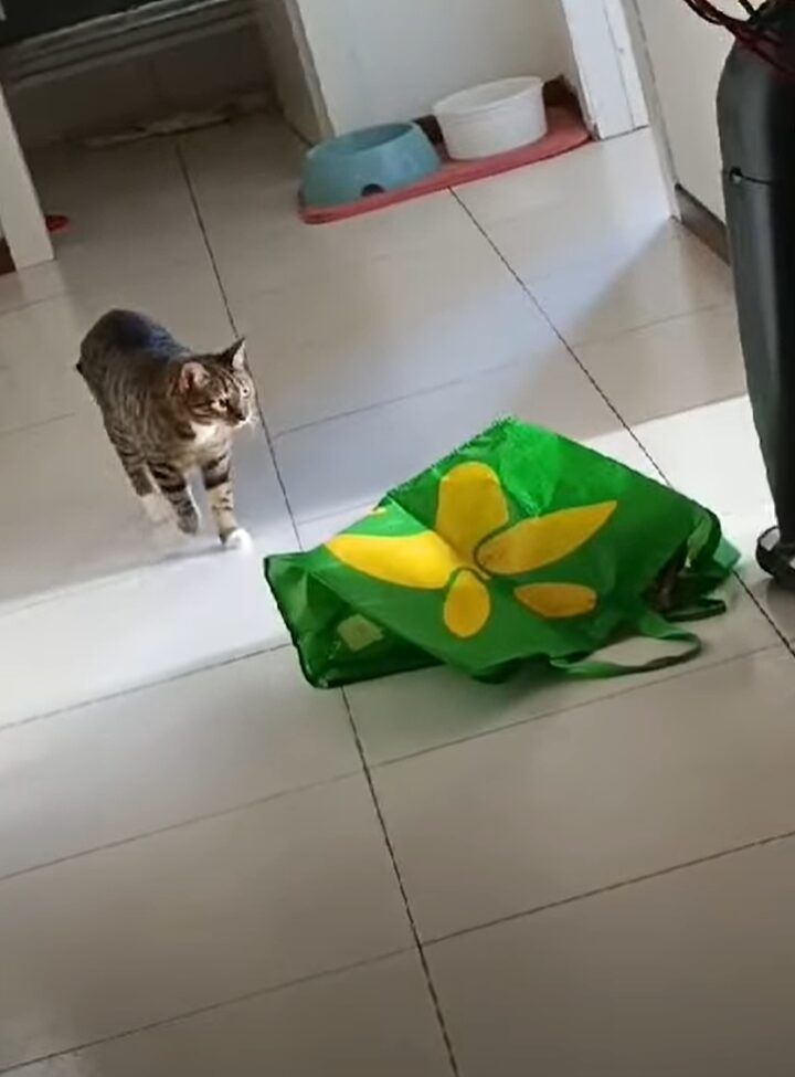 3. エコバッグを訝し気に見つめる猫。この子の勘は当たったみたい。横を通ろうとした瞬間ビックリすることに!!【海外・動画】
