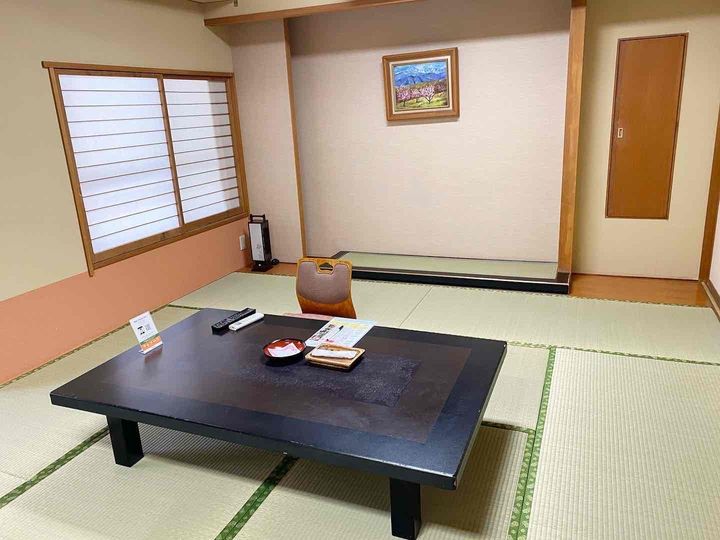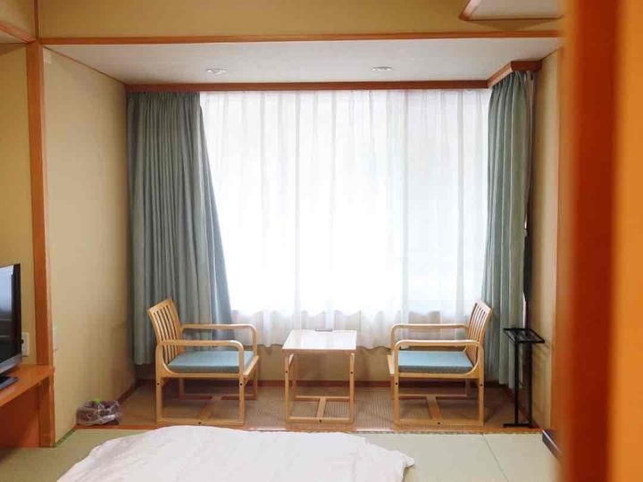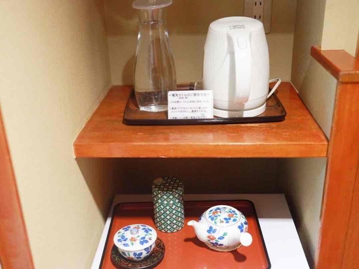 客室は広々としていてシンプル。テーブルでおまんじゅうをいただいたりパソコンを開いたりと、ゆっくり過ごせました。