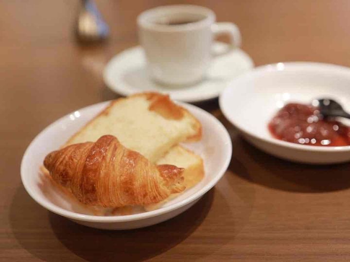 バターの豊かな香りが引き立つ焼き立てのクロワッサンは絶品。焼き立ての食パンには、ぶどうのジャムを添えてくだいさいました。
