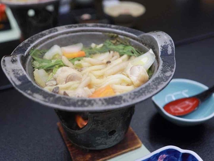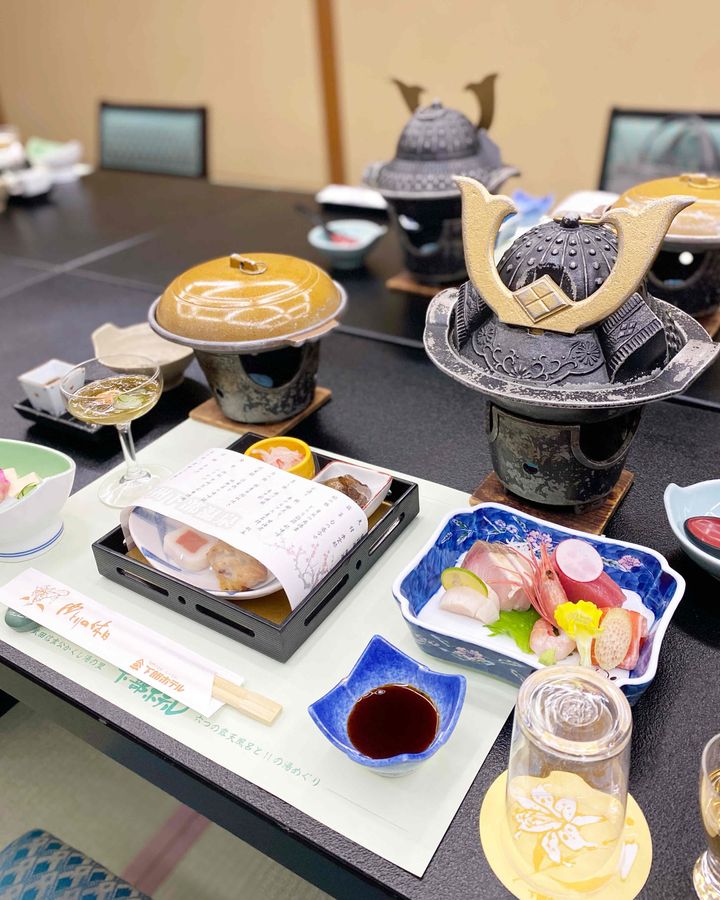 山梨県の魅力を凝縮したという、里山料理の夕食。兜型の蓋がかっこいいお鍋の中身はうどんです。和牛に地鶏、お造りなど主役級のお料理が一堂に会する超豪華なメニューに、お腹も心もいっぱいになりました!