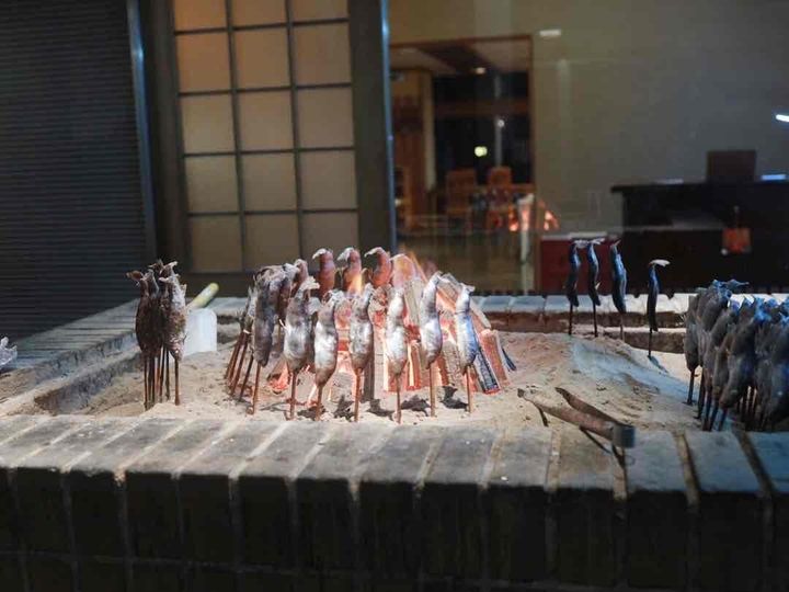 朝食会場である「山のかまど」のすぐ隣では、タイミングが良ければガラス越しに山女魚を焼く様子を見られます。