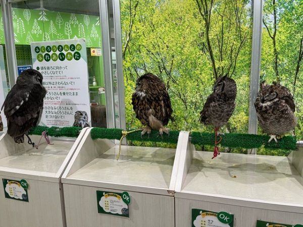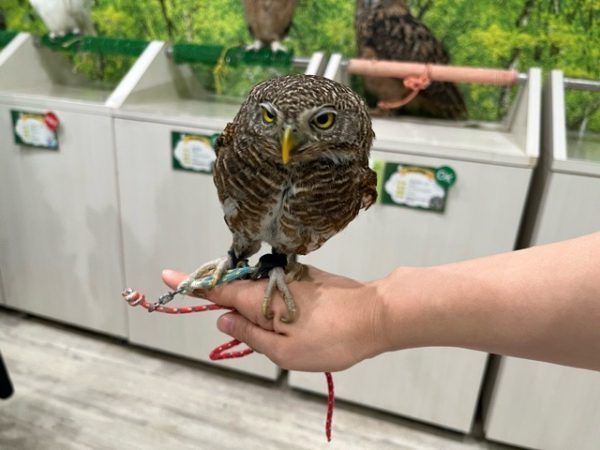 私が最初一番驚いたのがフクロウゾーン。 フクロウゾーンにはフクロウやミミズクがたくさんいるのですが、なんとこの子達とも触れ合えます。