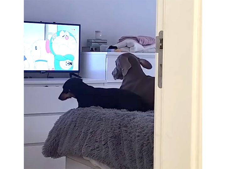 アニメに夢中になっている二匹の犬さん。