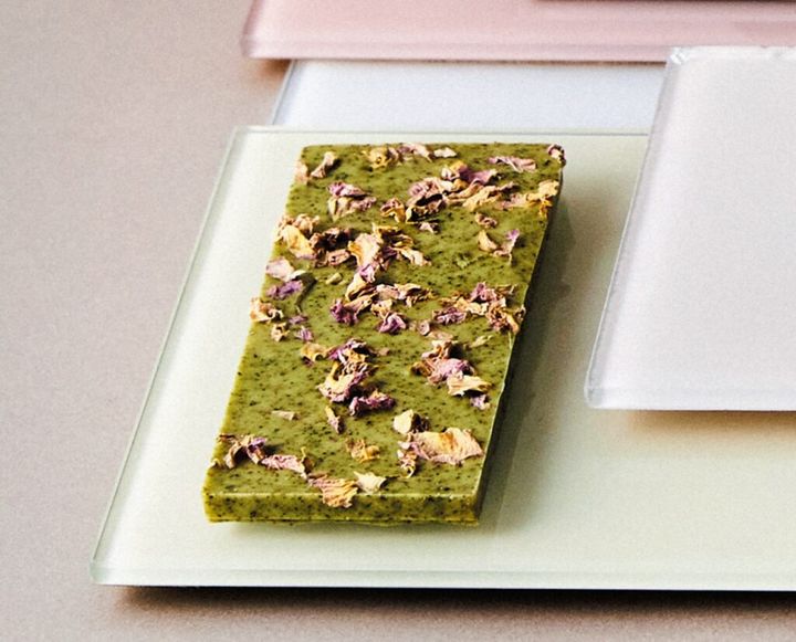福岡県福岡市に本店を構える『shodai bio nature』が、新店舗をオープン。ここではオーガニック素材や自然由来の素材のスイーツを提供しているが、麻布台ヒルズ店ではヴィーガン、グルテンフリーにも力を入れる。チョコレートの注目株は、ヴィーガン対応のタブレット。なかでも「ヴィーガンホワイト 島原茶と薔薇」は、ライスミルクを使用した有機ホワイトチョコレートで作られているのがポイント。島原の煎茶の香ばしさが際立つ、やさしい甘さ。タブレットの表面にちりばめられた薔薇の花弁も粋。
