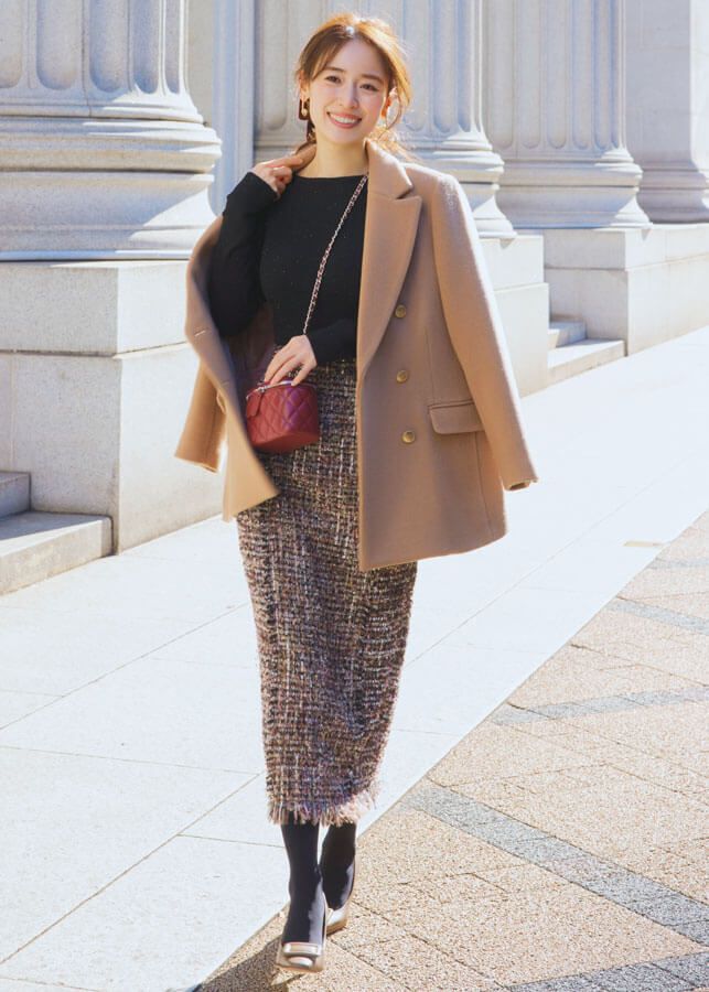 すっきりスマートなライン=〝きちんと見え〟につながるので、スラッと見える服を心がけて。デートシーンでは品格を大切にしたいから、ダボッとゆとりがあるシルエットよりも、 スタイルがきれいに見えるものをチョイス! ニットのフィット感×ロングペンシルの相乗効果できれいなIラインをメイク。キャメルのジャケット風コートとツイードでクラス感たっぷりに。