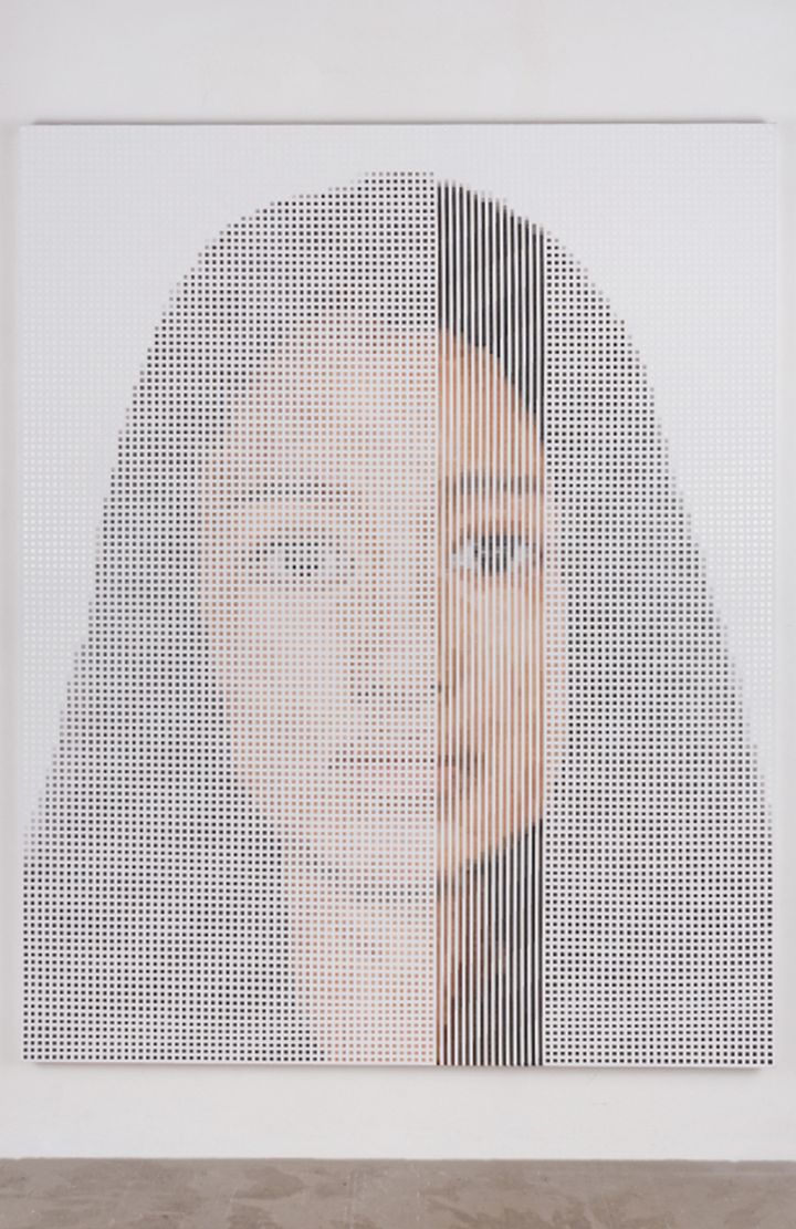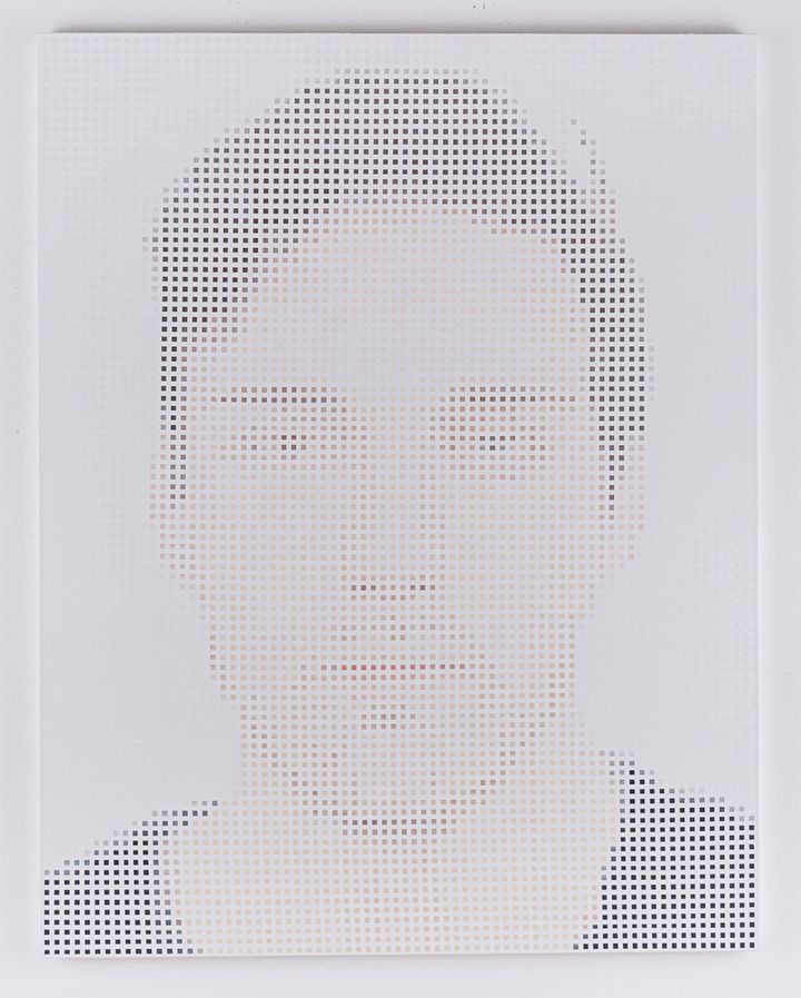 親しい友人の証明写真をピクセル状の色面で大きなキャンバスに描いた「tie」は、特定の感情を表出しないよう、ニュートラルな表情を保つことが要求される証明写真の特有性に焦点を当て、社会的空間における個人の形成を彼の視点で捉えたもの。