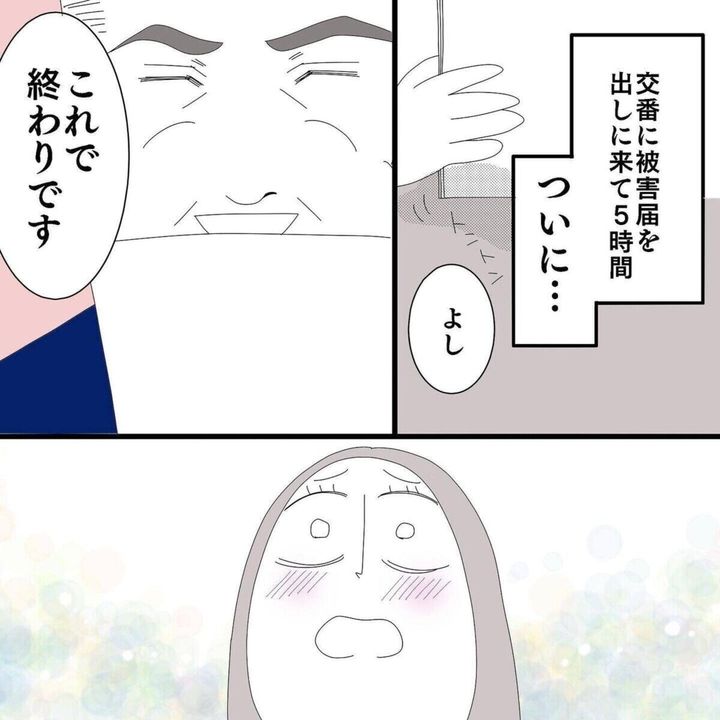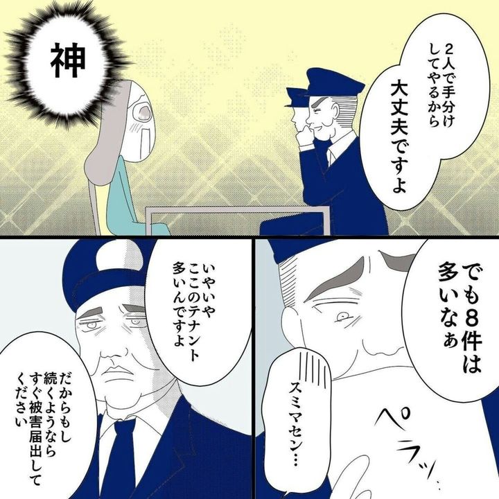 「被害届を8枚書くのに8時間はかかる」と言われたはなうささん。そこへベテラン警察官が現れ、「ちゃちゃっとやっちゃいましょう!」と言います。さらには「困った時はいつでも言ってください」と優しい言葉をかけてくれたのでした。はなうささんもここまで親身になってくれるとは想像もしていなかったはず。