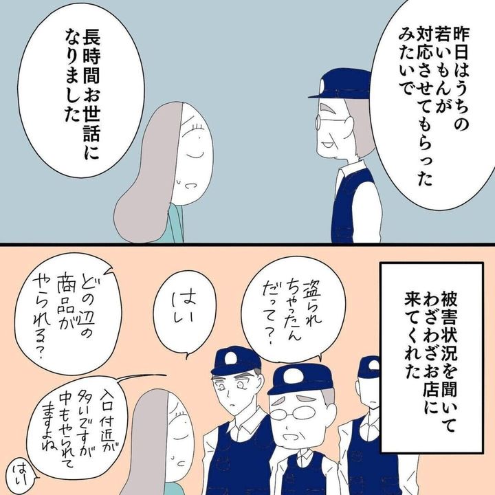 アパレル店員として働いていた、はなうさ(@hanausagimama)さん。お店で月に8件も盗難があり、警察に「被害届」を出すことに。しかし、「被害届」を出すのは想像していた以上に大変なことでした。あきらめて一度お店へ戻ろうとしたはなうささん。しかし、警察官に呼び止められることに…。無事に「被害届」を提出し、盗難被害を減らすことはできるのでしょうか。『盗難被害届を出した話』ダイジェストでごらんください。