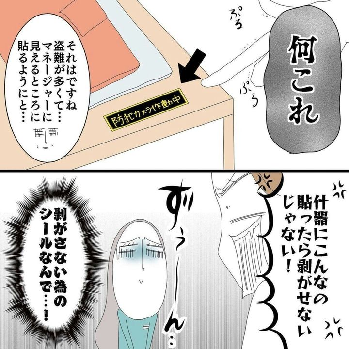 盗難被害は減ってきたものの、はなうささんは新たな問題に直面することに。「防犯カメラ作動中」というシールを見た上司に「貼る場所を考えて」と叱られてしまったのです。