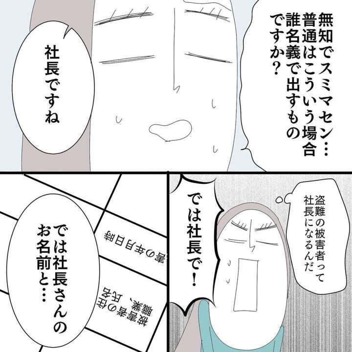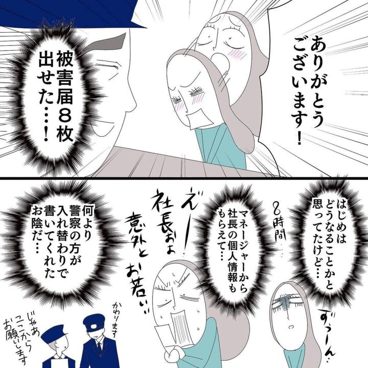 警察官の言葉に背中を押され、「被害届」を書くことになったはなうささん。しかし、社長の名前や住所など個人情報を聞かれて早速困ってしまったようです。お店の情報ならまだしも、社長の情報まではくわしく知らないものですよね。無事に解決できるでしょうか。