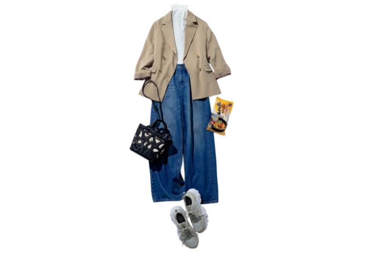 デニムをキレイめに仕上げるコツは、きちんと感のあるアイテムを1点入れ込むこと。ボックスシルエットのハンサムジャケットなら、シルエットも今っぽく、テンションもちぐはぐになりません。