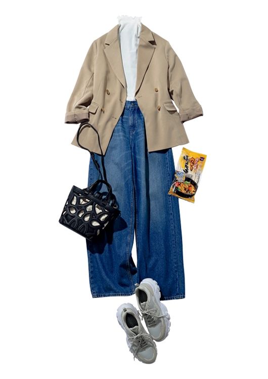 ジャケット¥8,798/グローブ、デニムパンツ¥8,910/ギャレスト(ともにワールド)、シアーカットソー¥1,590/神戸レタス、カットワークバッグ¥5,990/ZARA(ザラ)、スニーカー¥8,800/ORTR( ダブルエー)