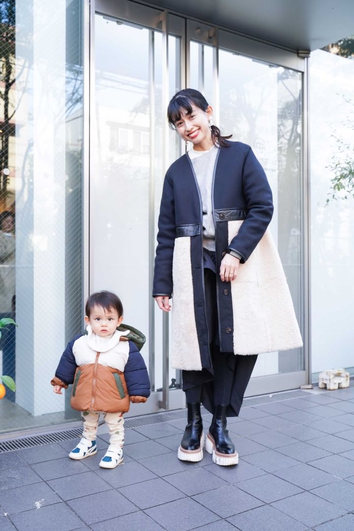 Plan Cのコート、PHEENYのスウェット、seaのスカート、STELLA McCARTNEYのブーツ、Kalevalaのピアス、YOHEI NOGUCHIのブレスレットは全て本人私物/息子さん:ZARAのコート、organic zooのボトム、familiar×ASICSのシューズ、MARLMARLのスタイは全て本人私物