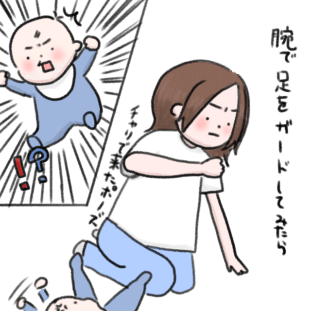 3. 赤ちゃんから足攻撃・・やめてー(汗)腕でガードしてみたら・・そう来たか!|ねむりひつじの子育て絵日記