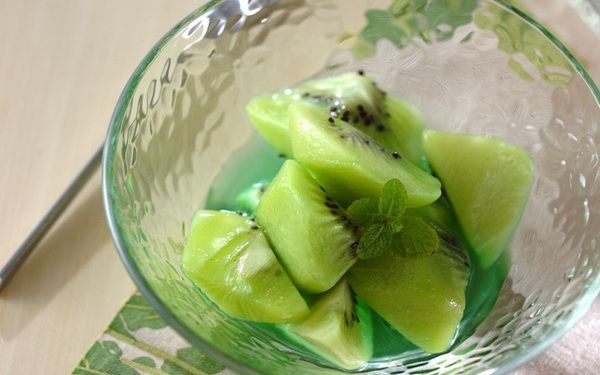 甘酸っぱいキウイにミントリキュールをかけると、お口直しに最適です。ミントの清涼感のある香りがくせになります。キウイの緑とリキュールの青のコントラストもキレイで、目でも楽しめますよ。