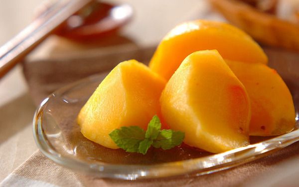 濃厚な甘みが人気の柿にリキュールをかけると、ちょっと贅沢なデザートに。柿は実が硬くしっかりした品種を選ぶと崩れにくく、ホワイトキュラソーにも合いますよ。オレンジの華やかな香りと柿の甘みで、ついつい手が伸びる美味しさです。