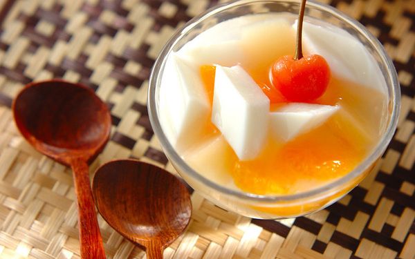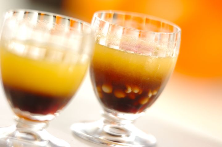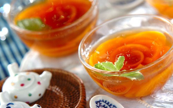 甘さ控えめのウーロン茶ゼリーに、ピーチリキュール入りのシロップをかけると甘い香りが広がり、お店顔負けの一品に。黄桃缶は薄くスライスすると、花のように並べやすいですよ。ゼリーから透けた黄桃が映えるよう、ガラスの器を使うのが◎。