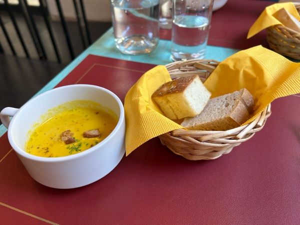 カボチャスープとパンを美味しくいただきながら、お友達とのおしゃべりを楽しみます。