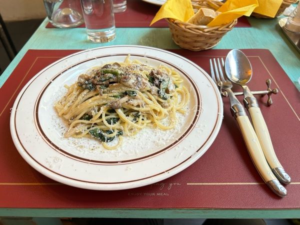 私の「ベーコンときのこ、ほうれん草のクリームパスタ」もちもちの麺にクリームが良く絡みます。
