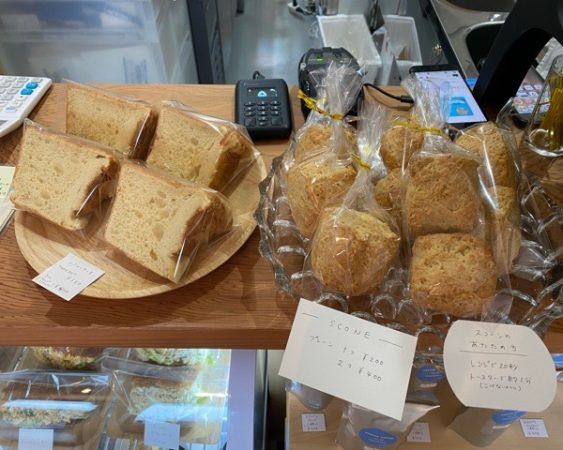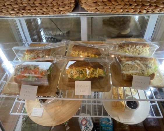 店内に入ったら、先に注文します。サンドイッチはバケットサンドで三種類、フレッシュバジルチキン、たっぷりたまご、たっぷりポテトサラダです。ショーケースに並んでいますので、見てみてお好きなものを選んでくださいね。スコーンやシフォンケーキなどもあります。