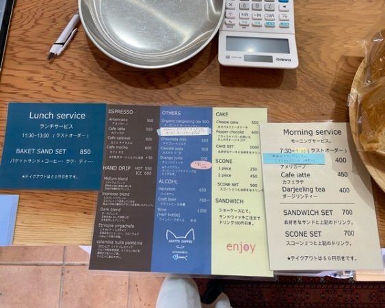 7:30~17:00まで営業していますが、モーニングサービス7:30~9:00には、サンドイッチまたはスコーンセット(700円)、ランチサービス11:30~13:00には、バケットサンドセット(850円)のお得なセットがあります。でも、スイーツも気になります…。
