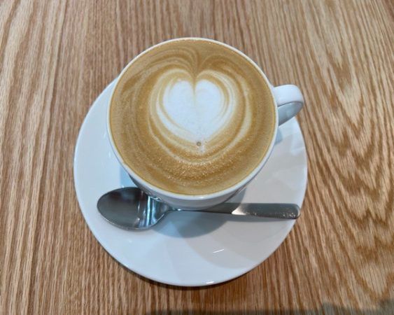 わりと大口で食べましたが、食べている間に何度もこぼれ落ちました。フォーク必須です!カフェラテも、可愛いハートが描かれています。