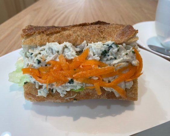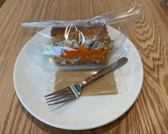 私はモーニングの時間にお伺いしたので、好きなサンドイッチとドリンク付きのサンドイッチセット(700円)にしました。サンドイッチは、バジルチキンサンド、ドリンクはカフェラテにしました。お会計も済まし席で待っていました。