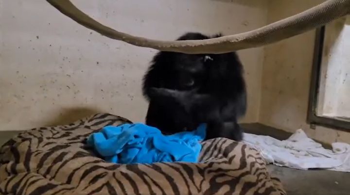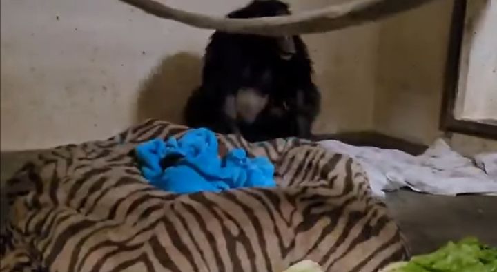 宿舎にやってきたマハレ。 映像中央のベッドにはタオルにくるまれた赤ちゃんが居るのですが、まだマハレはその存在に気が付いてはいません。