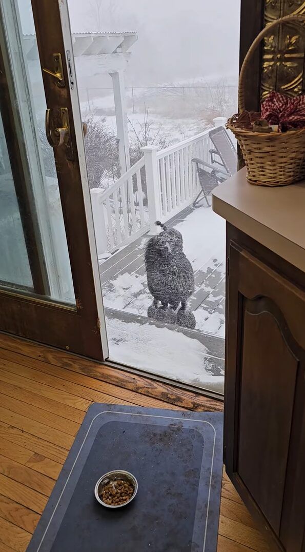 3. 吹雪がいっそ楽しい?プードルが雪が降り注いでいるのにお家に入らない!!【アメリカ・動画】