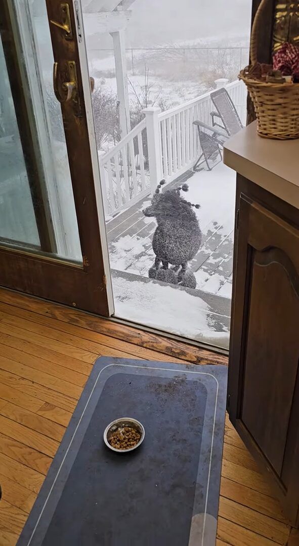 飼い主さんが声をかけるのですが、プードルはベランダにずっと立っています。 黒い毛並みのはずが、雪が降り注いですっかり真っ白になってしまっています。