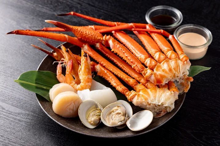 ディナー: 紅ズワイガニ、ホタテ、ハマグリ、有頭海老のボイル