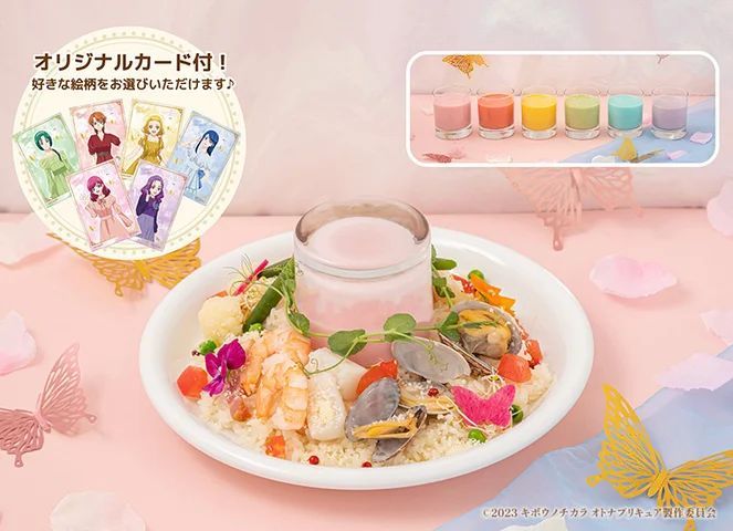 「のぞみ」「りん」「うらら」「こまち」「かれん」「くるみ」をイメージした、6色から選べるソースを添えた2種のリゾット、「咲」「舞」をイメージしたオープンサンドなどのフードメニューなどファンにはたまらないメニューが多数登場!描き下ろしアートを使用したオリジナルグッズや特典も見逃せません!