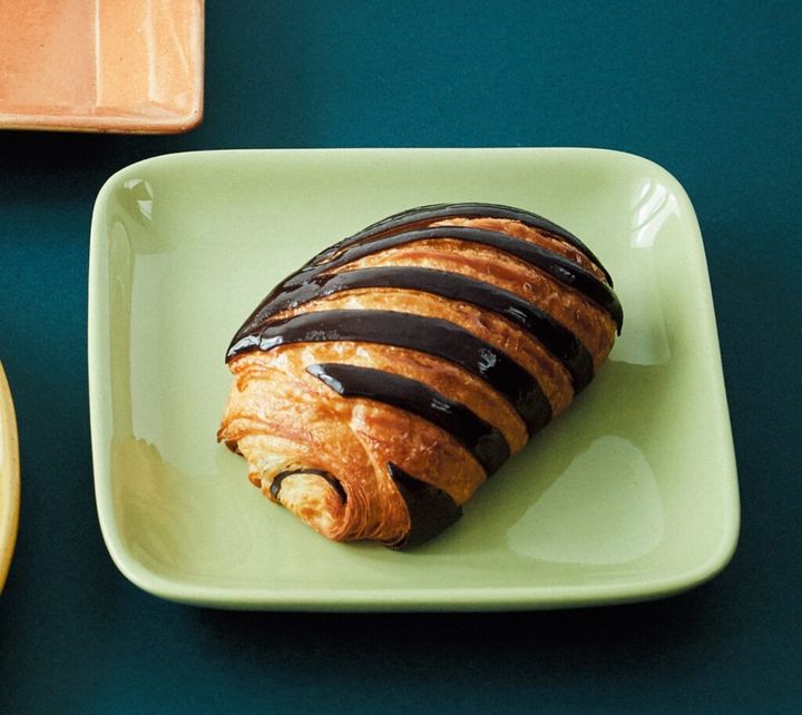 フランスの“おやつ”をテーマに、パンや焼き菓子を提供する『[Gouter]』。パティシエ兼ショコラティエのセバスチャン・ブイエさんが、独創的かつ遊び心あるパンを作り出す。「パン オ ショコラ」は、目を引く縞々模様がトレードマーク。茶色い部分はショコラ風味のクロワッサン生地。表面はサクッと、中はしっとりとした生地が、口どけのよいヴァローナ社のバトンショコラを包み込む。軽く食べられるので、まさにおやつにぴったり。トースターなどでリベイクすると、生地のサクサク感がいっそう楽しめる。
