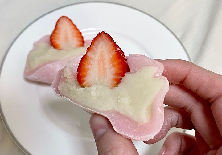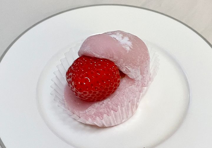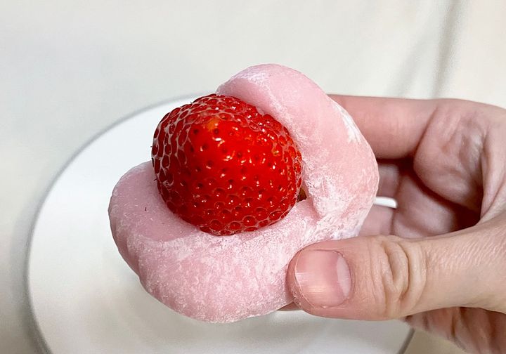 手で持ってみると、ずっしりと感じる重み。赤いいちごと、ピンクの大福生地の色味がかわいらしいですよね。いちごがごろっと1つトッピングされていて贅沢です。