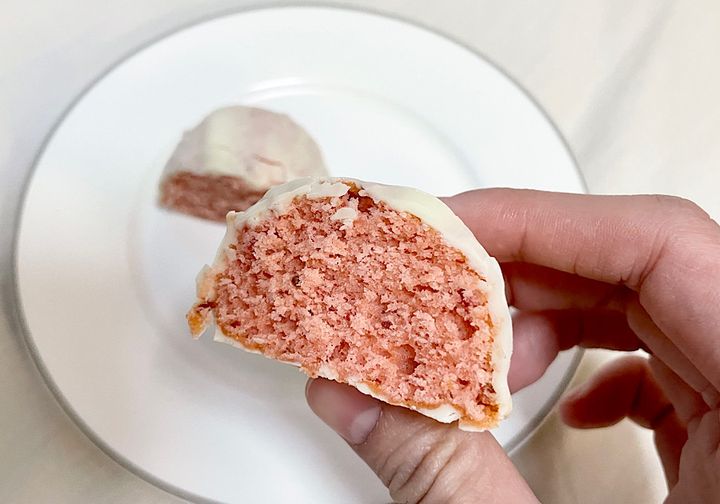 食べてみると、ホワイトチョコレートがパリッとしていて、ケーキのスポンジ生地はしっとり。異なる食感と、口に入れた瞬間すぐになくなってしまうほどのやわらかさに、幸せな気持ちになります。いちごの風味が爽やかで、軽い食感だからか甘みがくどくなく、1つぺろっと食べられるおいしさ。賞味期限は約1か月あり、一つひとつが小分けで売られているので、自分へのご褒美にストックしておくのもいいかも。