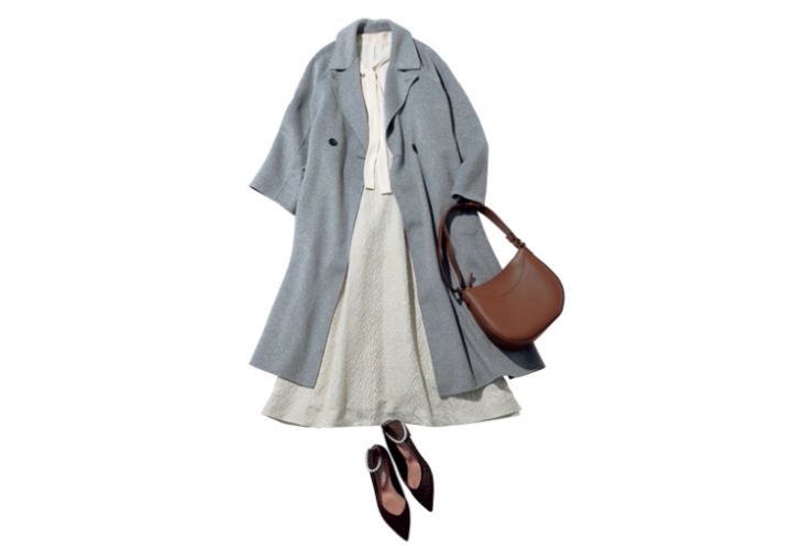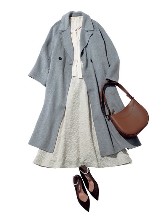 ウールコート¥29,000/PLST、ボウタイブラウス¥17,600/マイストラーダ、ジャガードスカート¥14,960/ミラ オーウェン ルミネ新宿2店、ショルダーバッグ¥2,990/UNIQLO、フラットシューズ¥18,150/ダイアナ(ダイアナ 銀座本店)