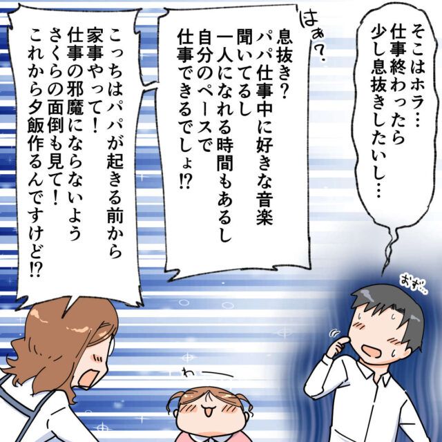 「はあ?息抜き?パパ仕事中に好きな音楽聴いてるし、一人になれる時間もあるし、自分のペースで仕事できるでしょ!?