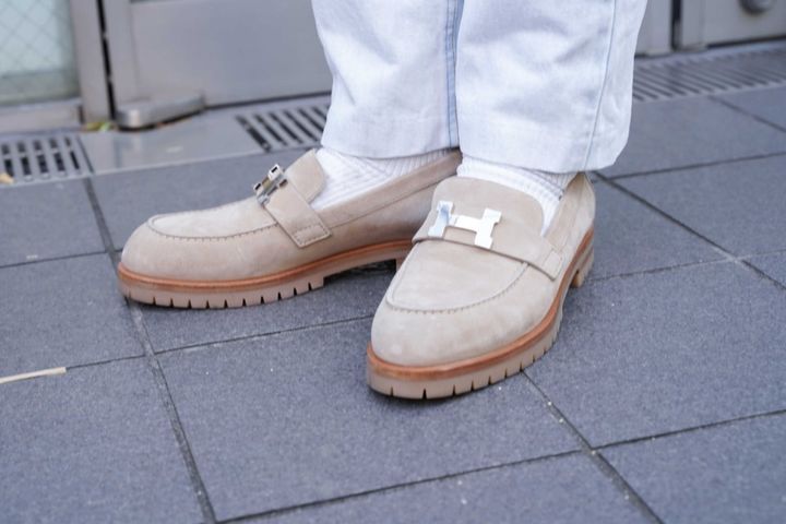 「HERMÈSで購入したスエードのローファーは程よいボリューム感がお気に入り。ミルキーなベージュで上品さが漂う一足です。象徴的なメタルパーツがアクセサリーのような存在感を放ってくれるのでコーディネートのアクセントに」HERMÈSのローファーは本人私物