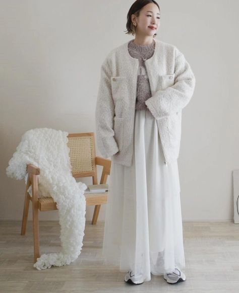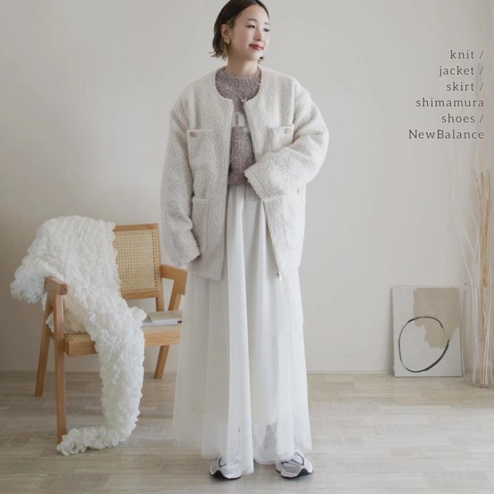 高見えすると話題の「リングツイードコート」もしまむらで注目のアイテム!重たくなりがちなアウタースタイルですが、透け感のあるチュールスカートを合わせることで軽やかな着こなしが叶えられています。あえてスニーカーをセレクトすれば、上級者見え間違いなしのスタイルに。
