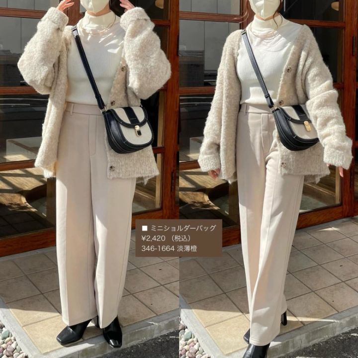 こちらは、しまむらの「ブークレニットカーディガン」を主役にした冬コーデ。インナーをハイネックにすれば、冬の着こなしにもぴったりな装いになります。アクセントには、レトロなバッグをセレクト。ブラックのブーツでほんのり辛口に仕上げたお手本コーディネートです。