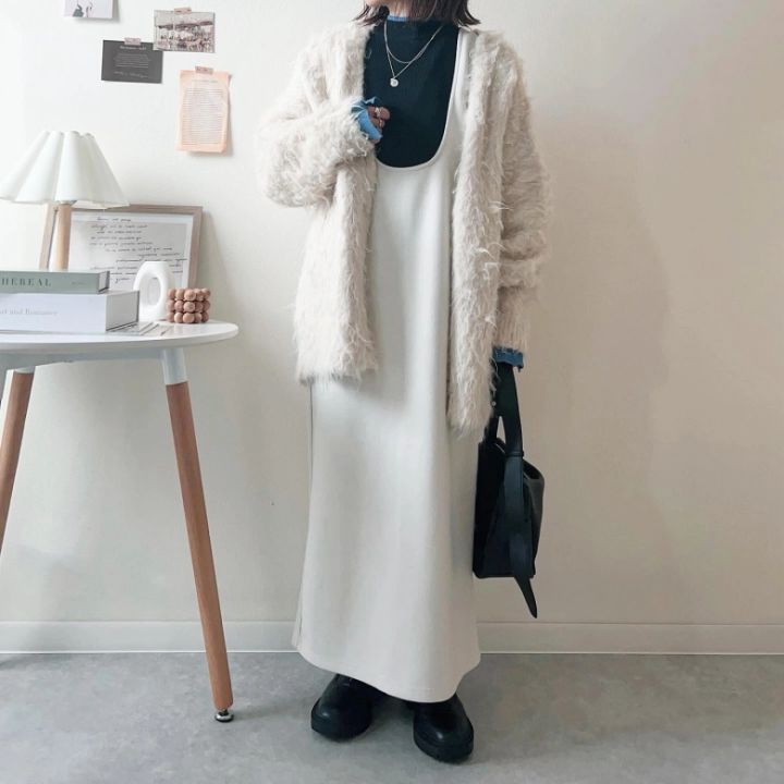 オールホワイトが苦手な方には、アクセントにブラックを取り入れるのがおすすめです。主役はパキッとしたホワイトカラーが目を引く、ストレートシルエットのロングワンピース。しまむらのアイテムです。ふわふわな質感のカーディガンを羽織れば、クリーンで好印象なスタイルが目指せます。