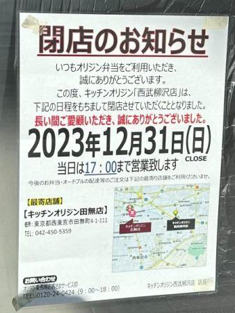 駅からアクセスしやすく、近隣の公園に行く際にもお弁当を調達しやすかった「キッチンオリジン西武柳沢店」が、なんと2023年12月31日で閉店していました。