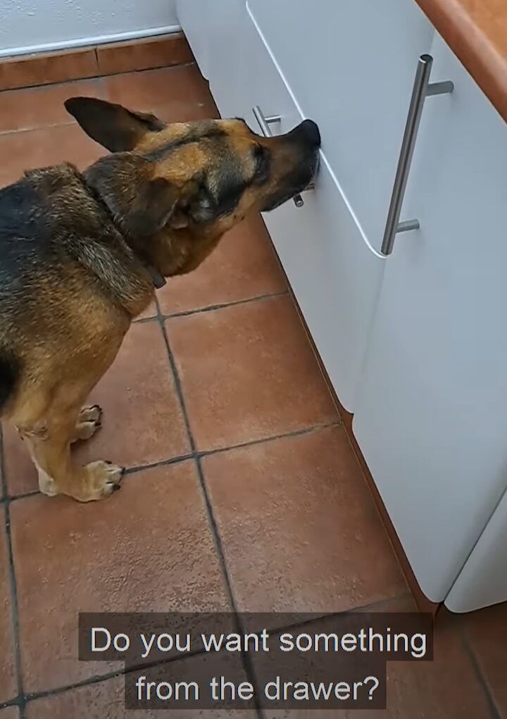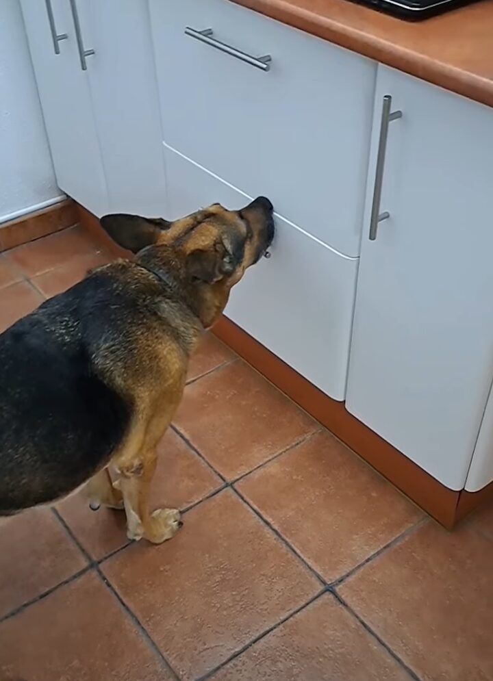 キッチンで引き戸の取っ手をくわえている犬。 飼い主さんに何かをアピールしているようですが、なぜこんな行動に出たのでしょうか?