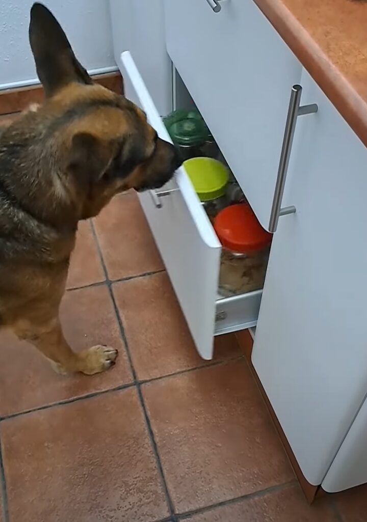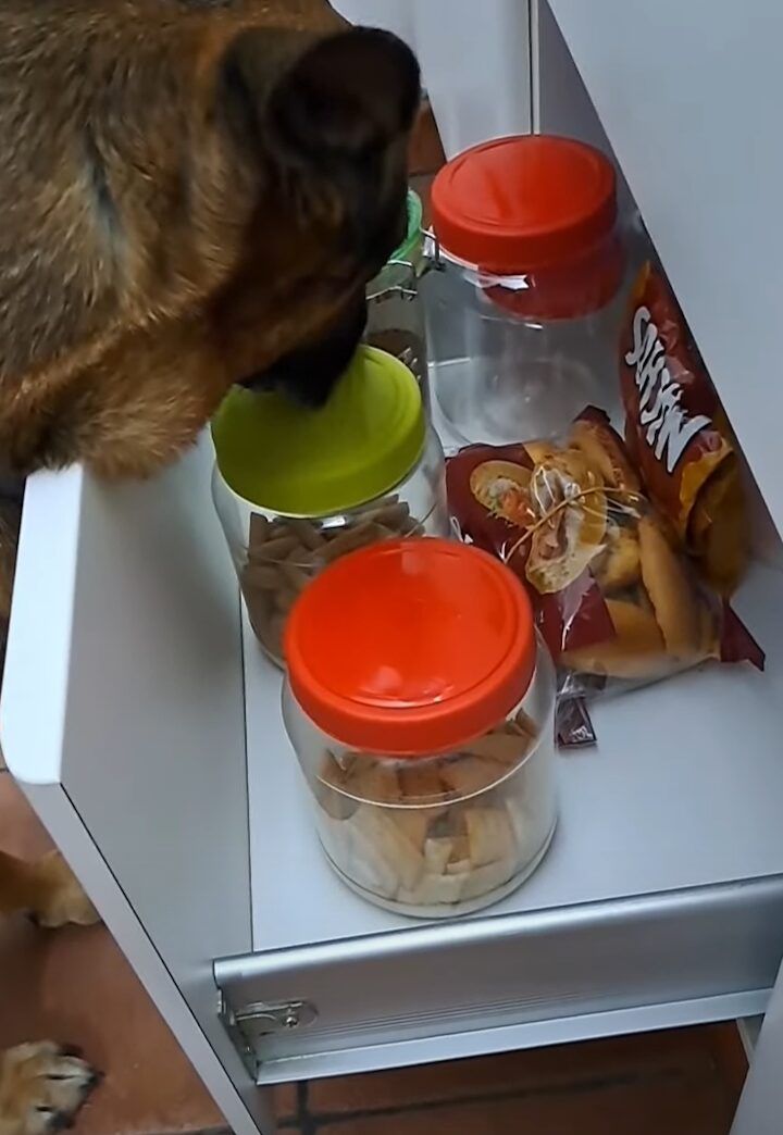 そこには、いくつかのタッパーがありました。 中身にはこの子のおやつが用意されているらしく、飼い主さんが「どれがいいの?」と問いかけると蓋が緑色のタッパーを鼻先で指しました。