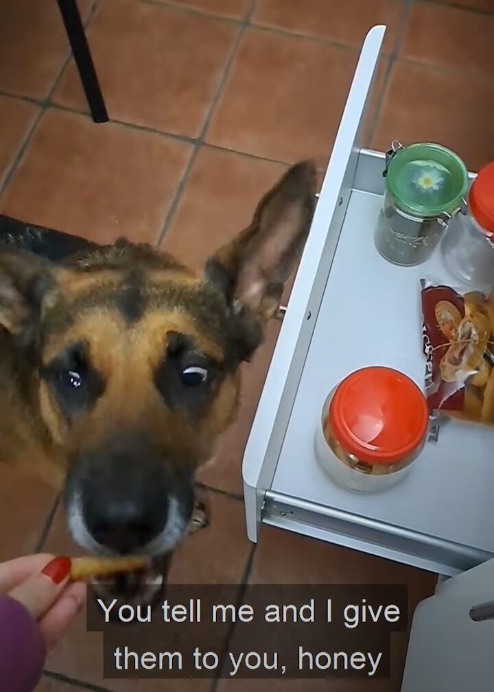 そこで、飼い主さんはそのタッパーを手に取ると、おやつを愛犬に与えるのでした。 お目当てのおやつが食べられて、愛犬も満足そうにしています。